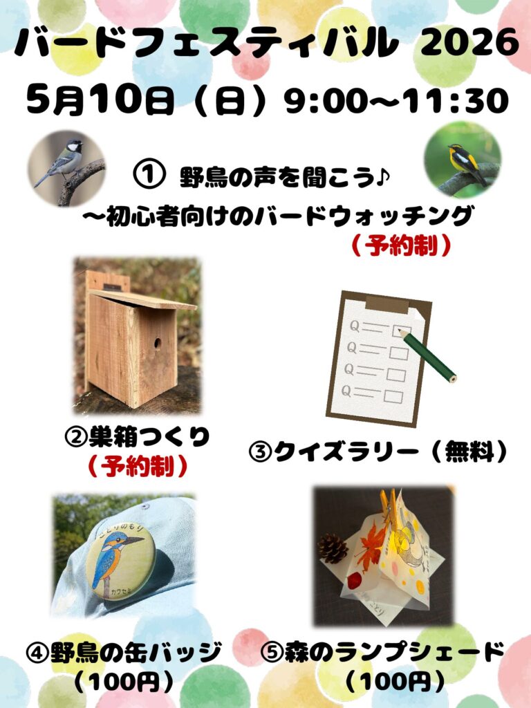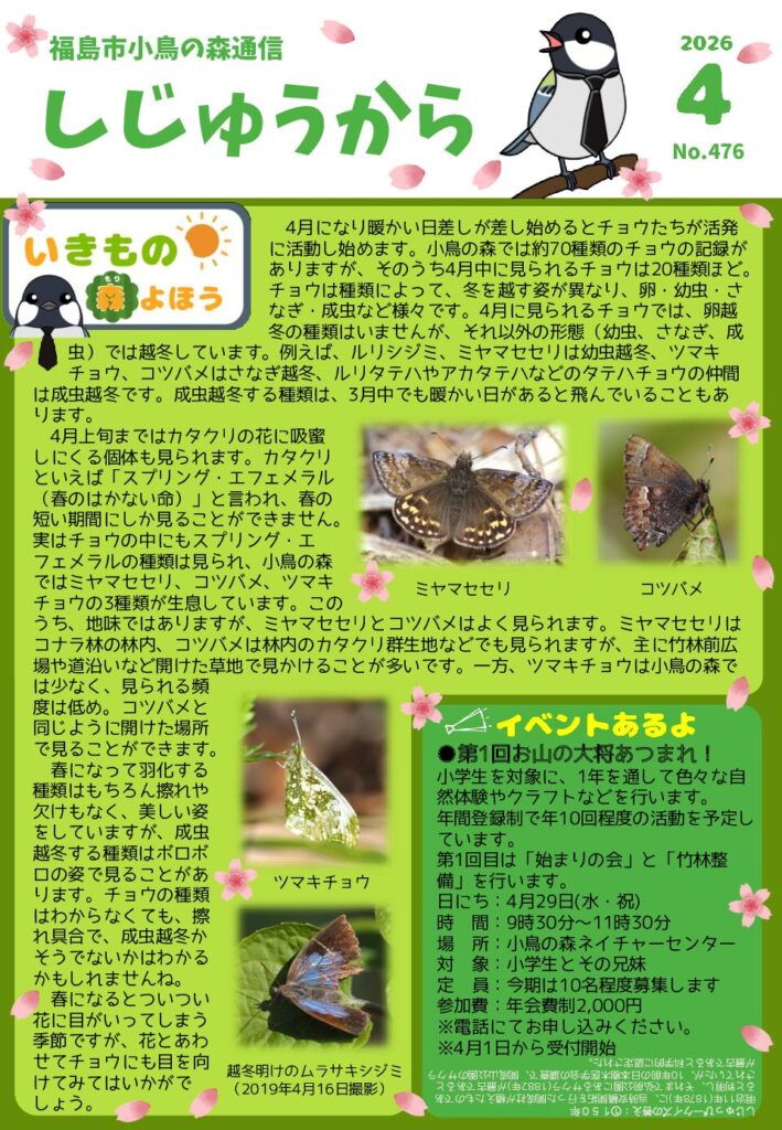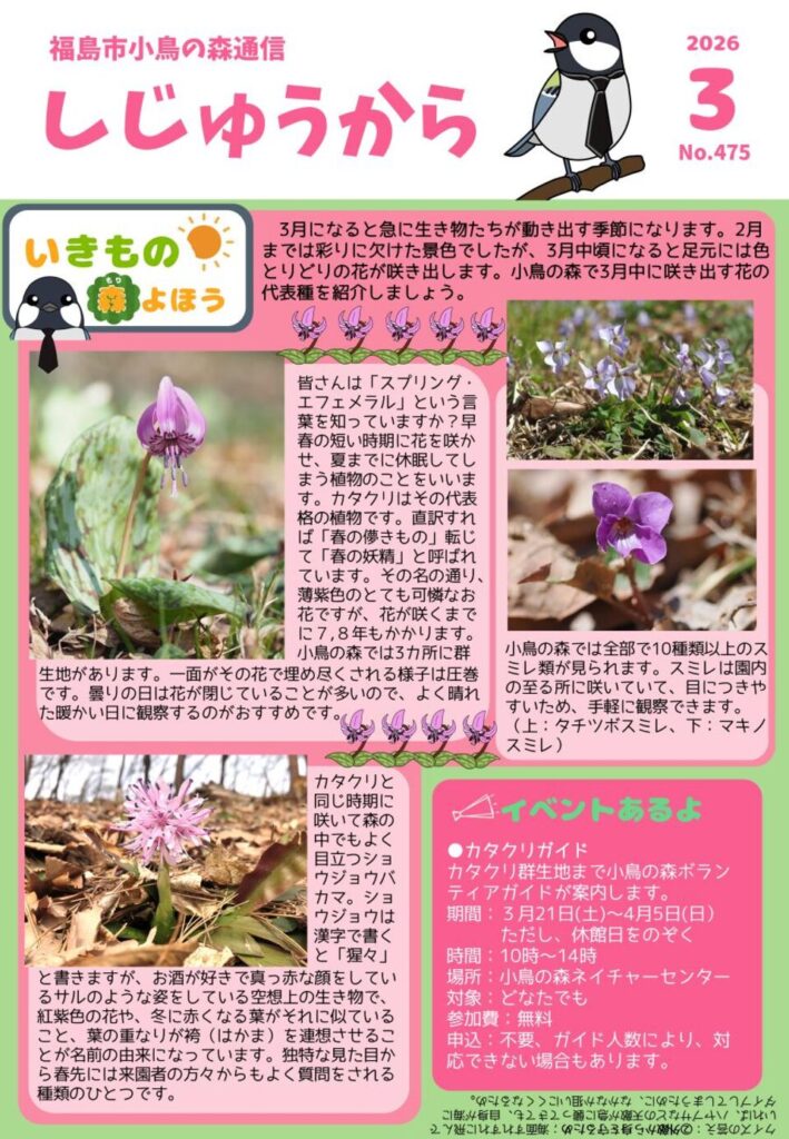 早春にはカタクリの花が群落地で一面に咲き、夏にはキビタキやサンコウチョウなど、冬にはツグミやジョウビタキ、マヒワなど、一年を通してはアオゲラやシジュウカラ、ヤマガラなどの野鳥を見ることができます。