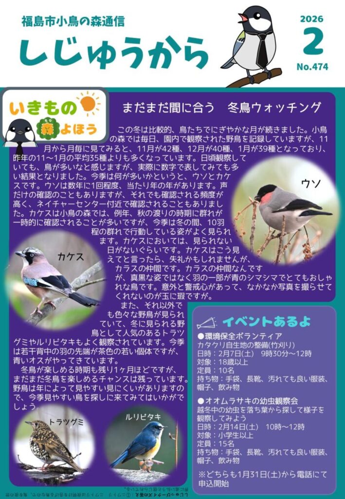 毎月、小鳥の森で観察できる野鳥や森の様子などをお知らせしています。